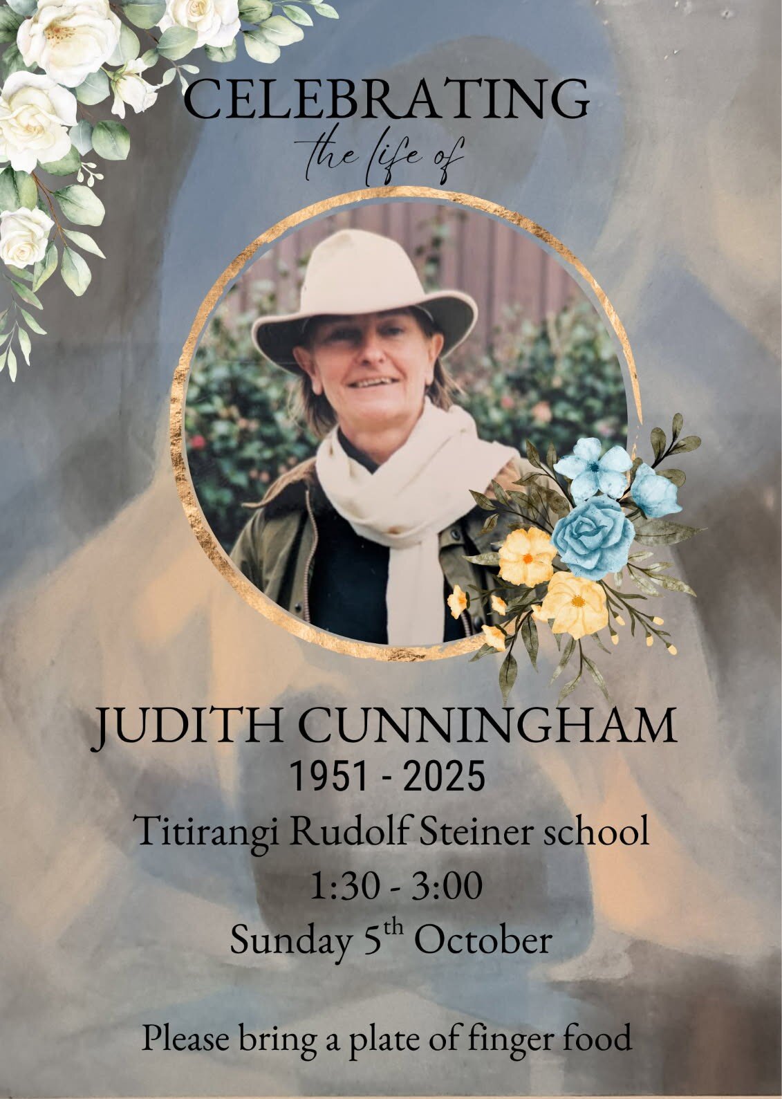 The Cunningham family together with Titirangi Rudolf Steiner School warmly invite all to come together to celebrate the life of our dear Judith Cunningham on Sunday 5 October.